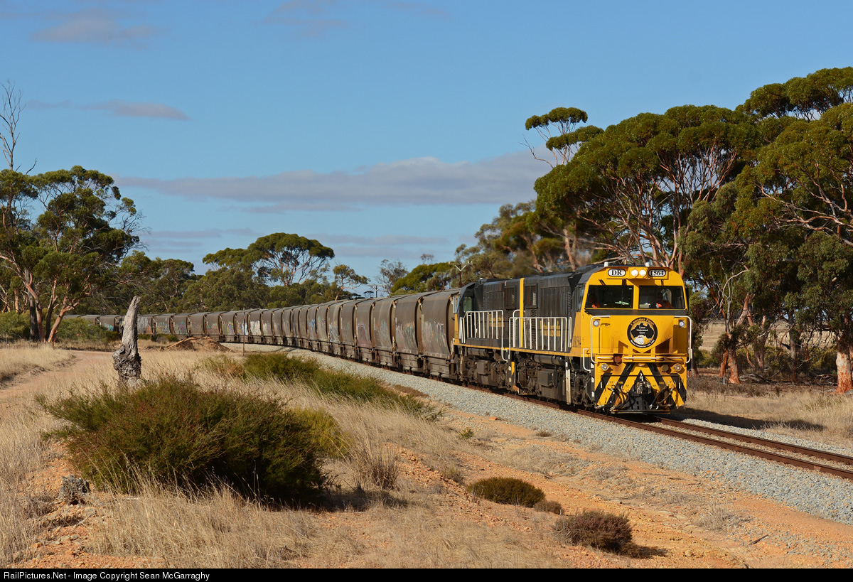 | Watco WA Rail's DR1564 & DR1565 work 3K64 loaded CBH grain train from Wyalkatchem to MGC Forrestfield. The locos are working hard up the grades near Benjaberring here. |