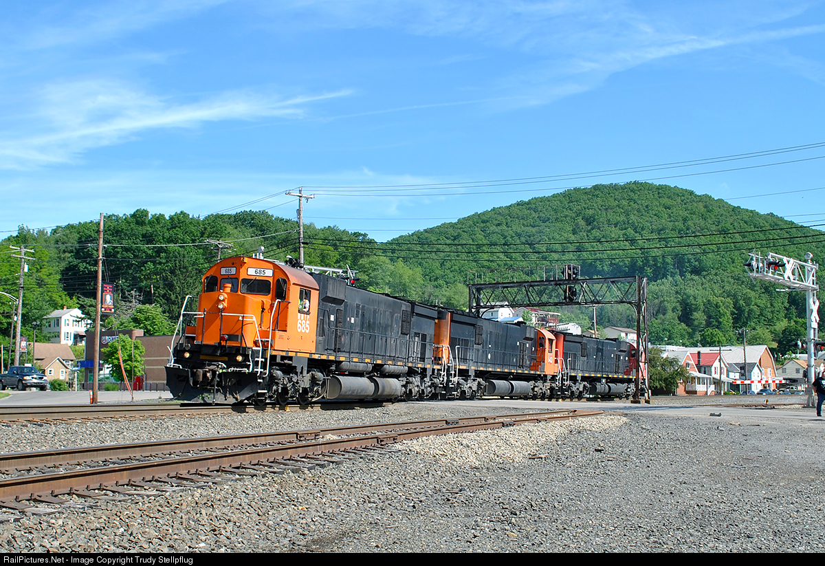 | WNYP "Bigs" will soon be replaced by used GE's. A trio of M636's head down to South Emporium to pick up sand loads, passing under the old PRR signal bridge. |