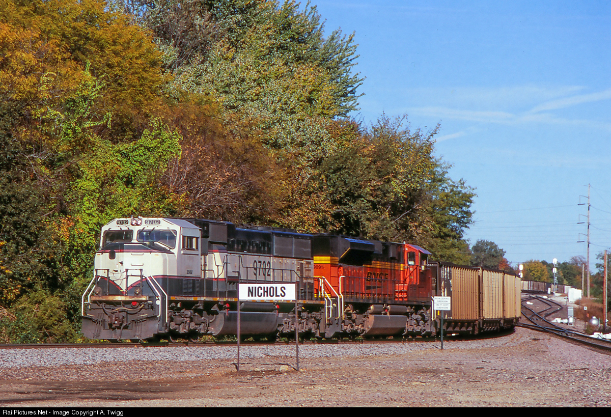 An old and tired ex-BN SD70MAC, still in its original BN executive paint, shoves the rear of a coal train through Nichols Junction towards the yard in Springfield. Originally serving as the Frisco's main diverging point west of Springfield, the junction still sees heavy traffic as trains passing through are routed either north to Kansas City or southwest to Tulsa. Shot on Fuji Velvia 100.