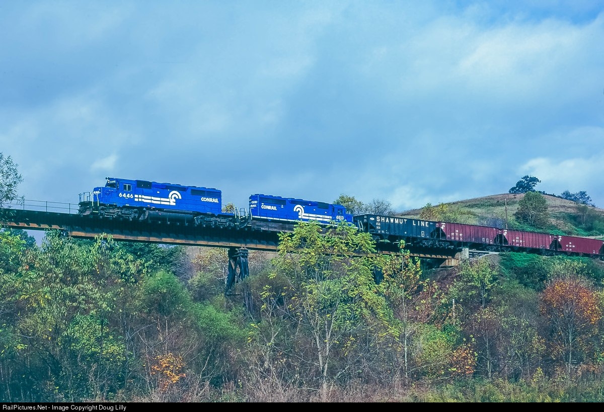 Wisconsin Electric’s coal trains that were sourced from Consolidated Coal Company’s mines on the Monongahela Railway were loaded with blended coal from two mines. After the cars were half loaded with black diamonds from the Baily Mine on the Manor Branch, the trains topped off at the Federal #2 mine in Wana, West Virginia. Here, the typical three-unit consist (two from CSX, one from the C&NW) has an added Monongahela GP38 for the trip down the Waynesburg Southern.