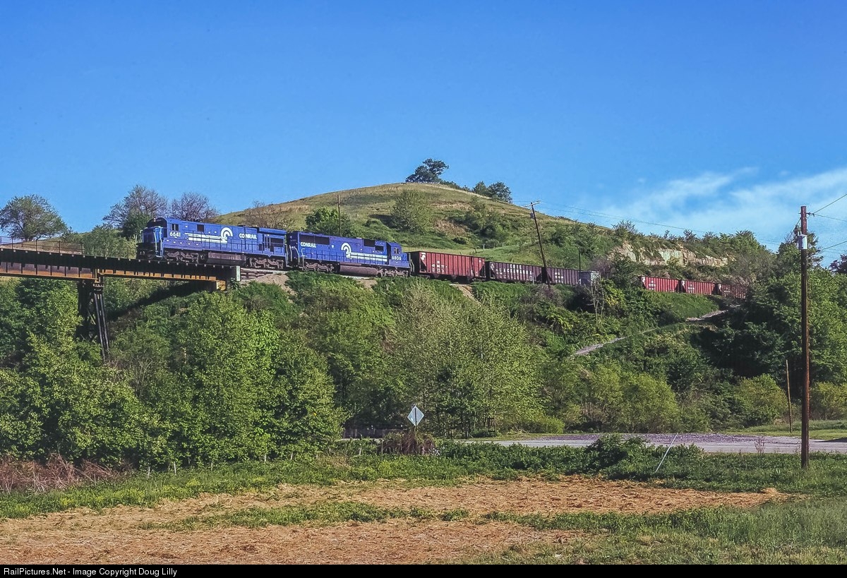 | Crossing the trestle at Pine Bank, Pennsylvania, an empty train led by a Conrail C36-7/SD50 combo moves south toward Blacksburg.