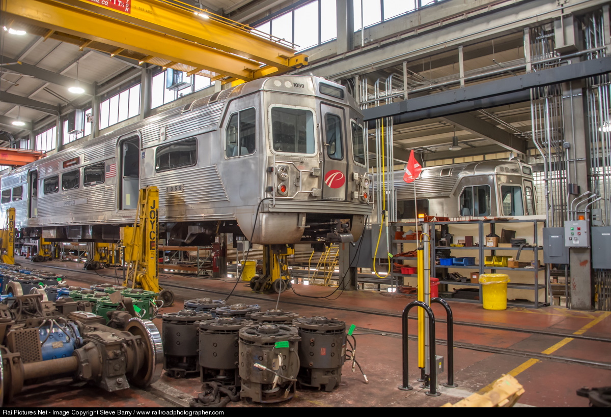 | A PATCO train is off its wheels as it undergoes maintenance at the transit agency's shop in Lindenwold. The cylinders in the foreground are traction motors. |