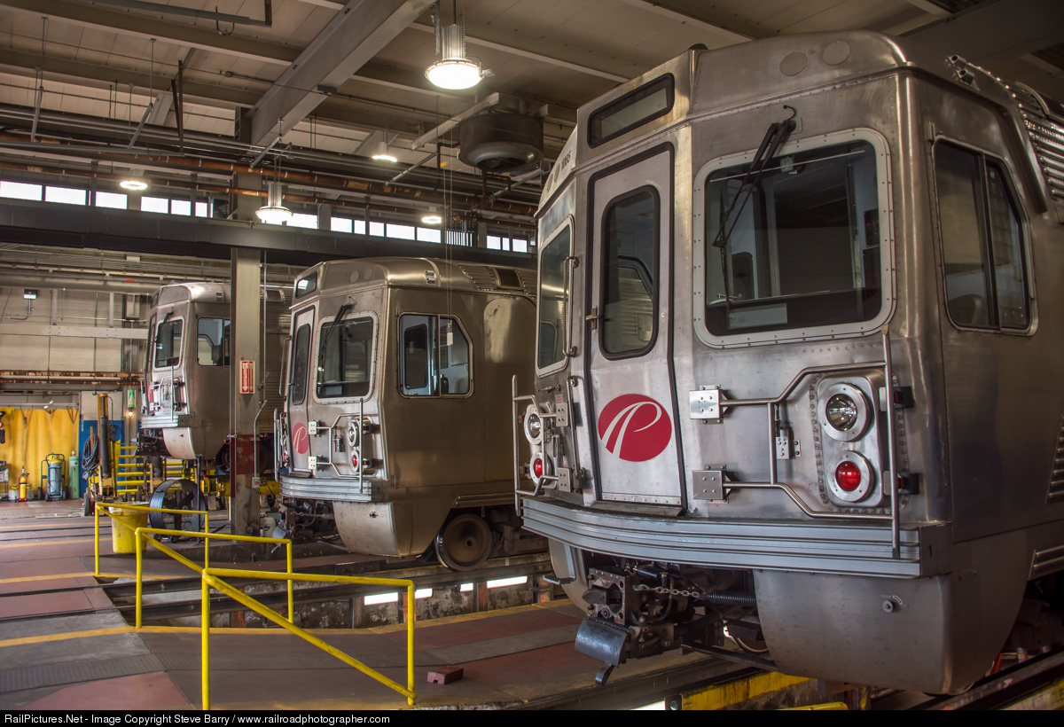Three PATCO trainsets rest in the shop on the weekend, awaiting the Monday morning rush hour.