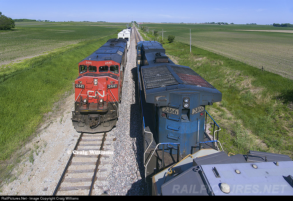 | Normally ever spring a weed spray train runs across the Iowa Zone on the CN. Each year you never know what type unit CN will put on it for power. This year a nice treat was this GE cowl unit.The crew has been working west on the Dubuque Sub spraying at 20 mph. Now they take a break in the Jesup siding to the a U708 pass before continuing west into Waterloo. Been alot more CN power in Iowa lately and unit ethanol trains are getting to become solid CN consists. That wasn't the case for this photo shoot.