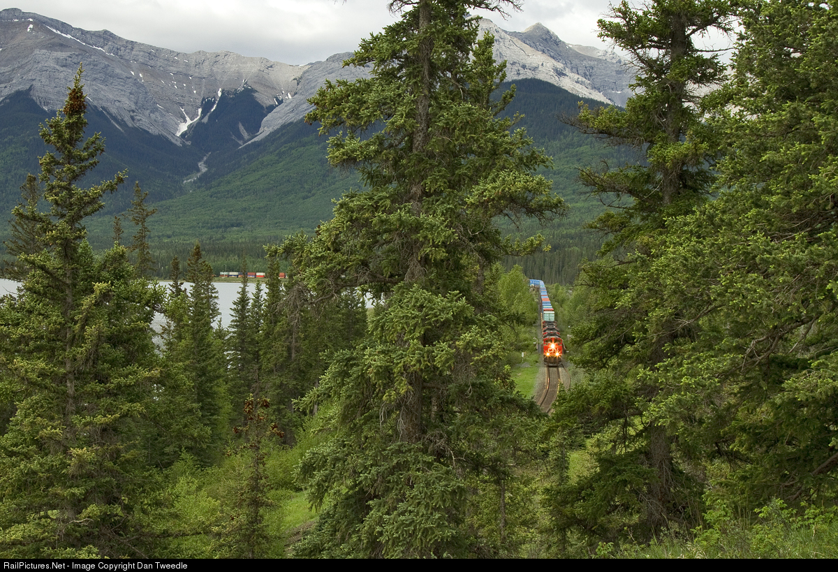 CN 8804 leads a stack train around the Athabasca River.