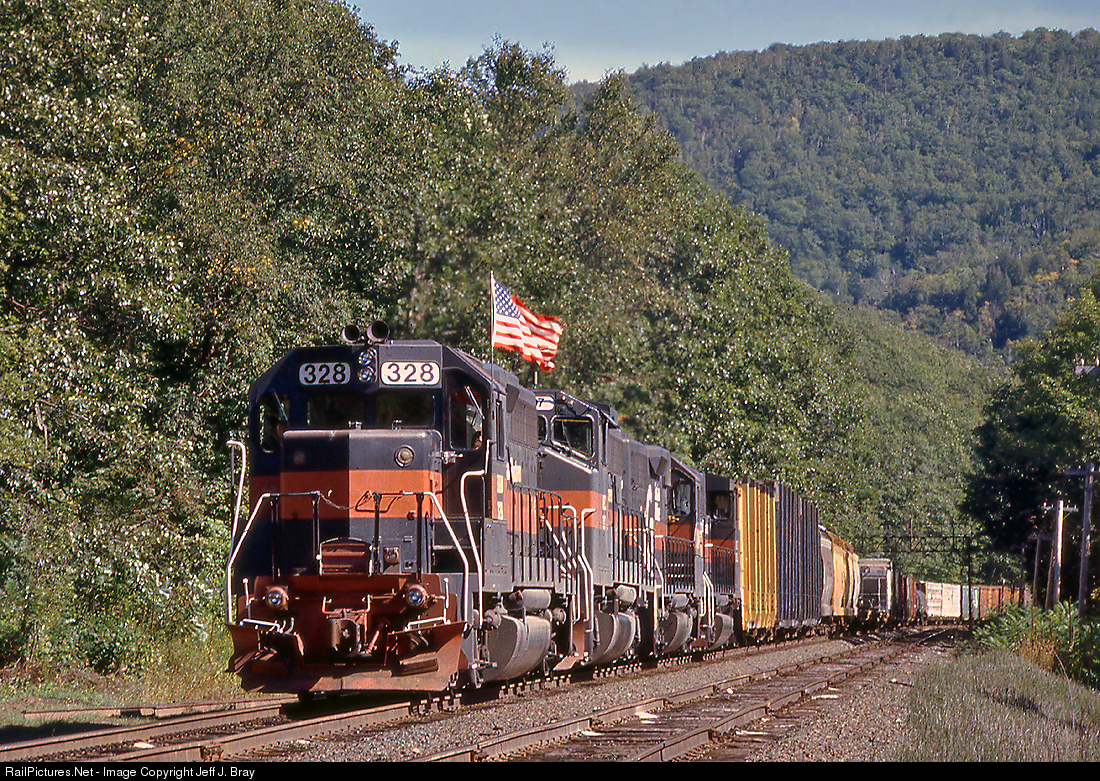 Scanned from a damaged slide.....September 11th was very fresh in the minds of Americans and the rest of the world that following Saturday on what would be a newly insecure visit to Guilford's west end. At that time, there weren't many die hard railfans covering District 4 regularly. However, a block of the "usual" core still made the trek to East Deerfield and points West. Everybody was unsure how railroads and railfans would respond to one another in this newly unfamiliar and vulnerable era. Sticking close to previously acceptable photo locations, Tunnel Road in Rowe at MP 415 was one such spot where we didn't have to worry much about things. Having already seen an eastbound down the siding, westbound EDRJ would be next and have the main for it's run to Hoosac Tunnel's East Portal. As it rounded the corner under what was left of the old signal bridge, smiles emerged at the sight of a big American flag above the cab roof. A nice roll-by was accompanied by a "thumbs up" exchange with conductor J.C. Scappace. From what I've heard, he recently passed away. RIP, and you'll live on in this photo