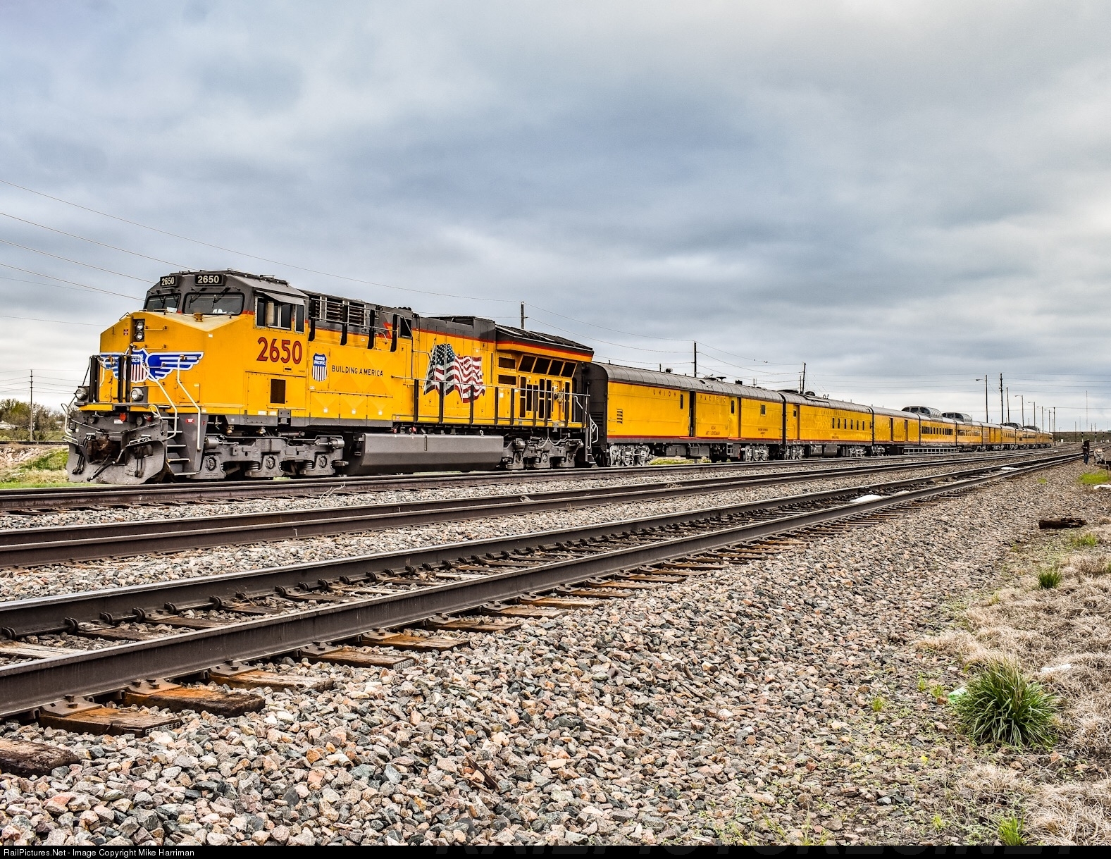 Fresh off the Hill from Laramie! Just after the steamers cut off to head for the shop after a successful excursion, the diesel power and consist wait on track 4. The steam support cars would be switched by 844, then 2650 would lead the rest of the train east.