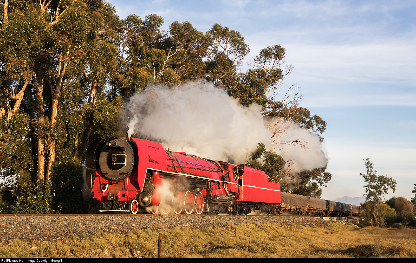 The unique 4-8-4 26 # 3450 "Red Devil" (Transnet National Collection) is leased by the Ceres Rail Company and made operational again since last year. The world most powerful "narrow gauge" (Cape gauge 1067 mm or 3 ft 6 inch) steamlocomotive is pulling a freight train for the FarRailTours journey, between Worcester and Ashton on the former Cape Central Railway line. The locomotive was built in 1953 as class 25NC by Henschel/Germany for the South African Railway (SAR). From 1979 to 1981 it was heavy rebuilt by mechanical engineer David Wardale from England while in the employ of the South African Railways. The rebuilding took place at the Salt River Works in Cape Town and was based on the principles developed by Argentinian mechanical engineer L.D. Porta. Using both mechanical and electronic indicating equipment, the Class 26 recorded 4,492 indicated horsepower (3,350 kilowatts) on tests between Pretoria and Witbank, a world record for a narrow gauge locomotive. According to the dynamometer car, this was then developing 3,787 equivalent drawbar horsepower.
