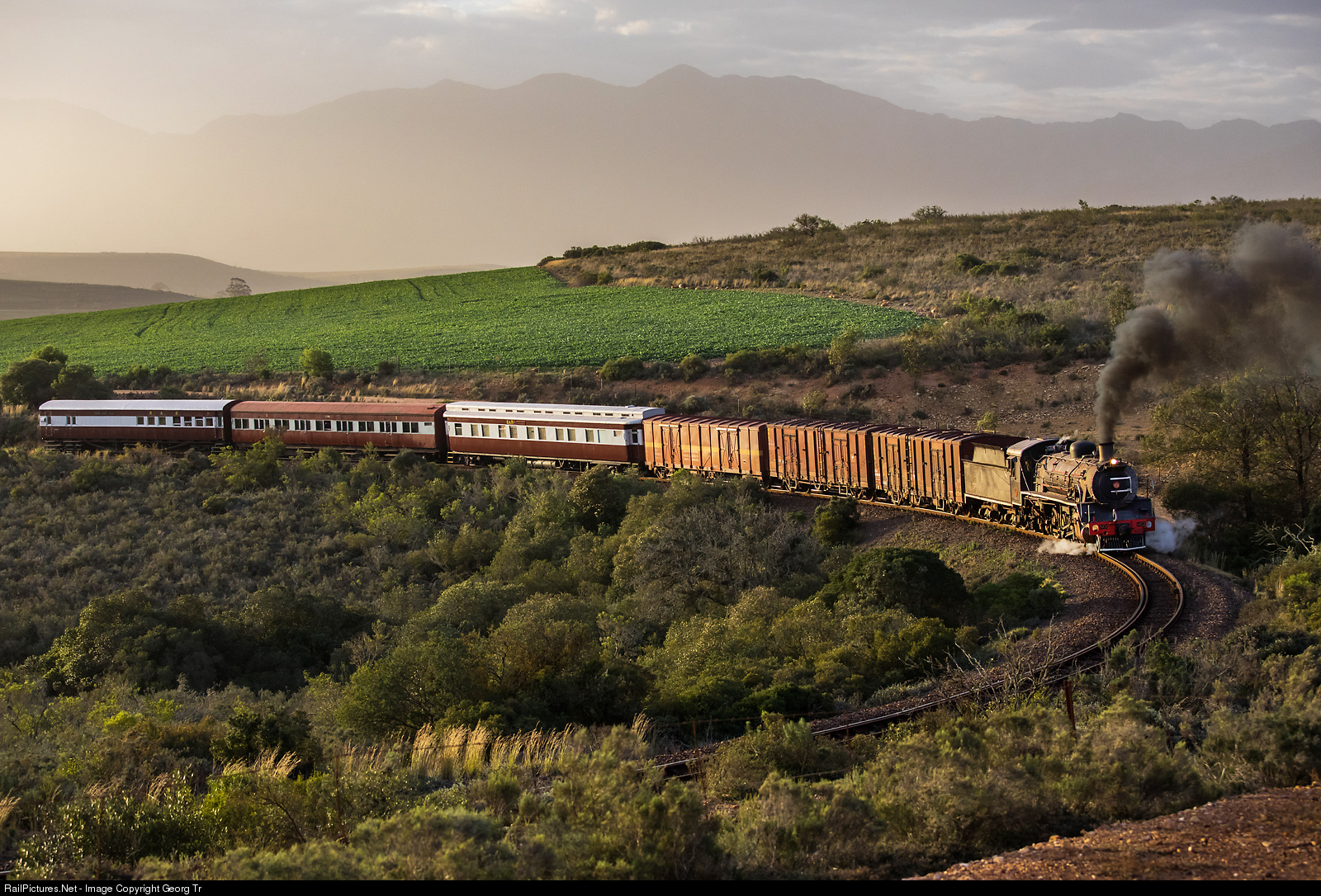 | 4-8-2 19B # 1412 of the South African Railway (SAR), now owned and operated by the Ceres Rail Company, built in 1930 by Berliner Maschinenbau AG/Germany, is pulling a mixed freight/passenger train for the FarRailTours through a tight curve between Drew and Jubilee on the former Cape Central Railway line. |