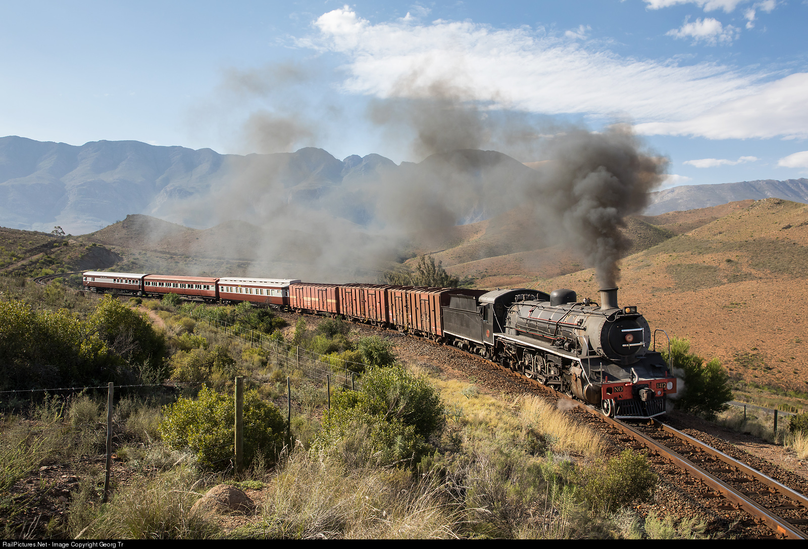 | 4-8-2 19B # 1412 of the South African Railway (SAR), now owned and operated by the Ceres Rail Company, built in 1930 by the Berliner Maschinenbau AG/Germany, is pulling a mixed freight/passenger train on the former Cape Central Railway line between Ashton and Bonnievale. A FarRail Tours charter of Bernd Seiler. |