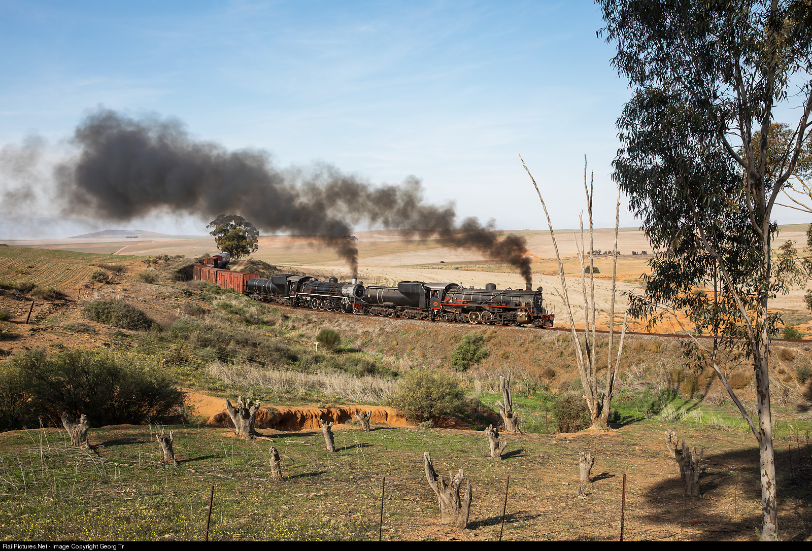 | SAR 2-8-4 (Berkshire) steamlocomotive 24 # 3655 (owned by Cape Western Vintage Railways, operated and maintained by Atlantic Rail) and 4-8-2 (Mountain) 19D # 3322 are pulling a mixed freight/passenger charter train on the Klawer line between Moravia and Moorreesburg. A Ceres Rail Company train for FarRail Tours of Bernd Seiler. |