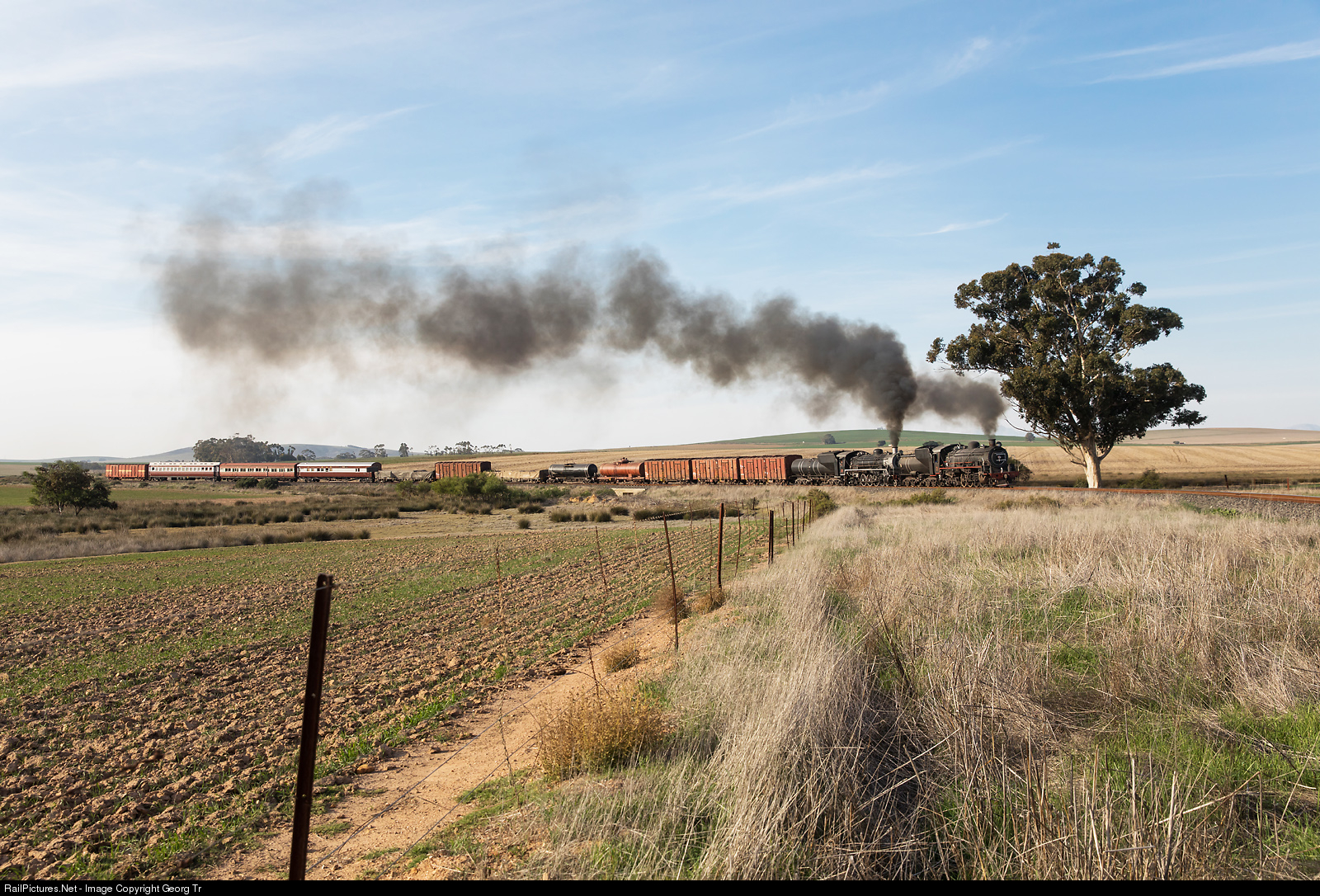 | SAR 2-8-4 (Berkshire) steamlocomotive 24 # 3655 (owned by Cape Western Vintage Railways, operated and maintained by Atlantic Rail) and 4-8-2 (Mountain) 19D # 3322 are pulling a mixed freight/passenger charter train on the Klawer line between Kanonkop and Malmesbury. A Ceres Rail Company train for FarRail Tours of Bernd Seiler. |