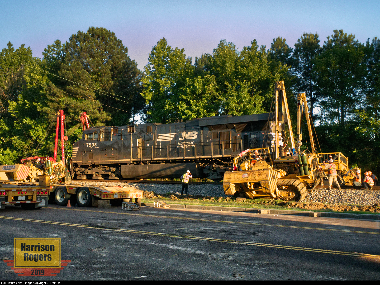 | Crews from Hulcher Services and RJ Corman work together to lift NS 7538 back onto the rails after it derailed. The derailment was caused when the train struck a truck carrying a roll-off dumpster. |