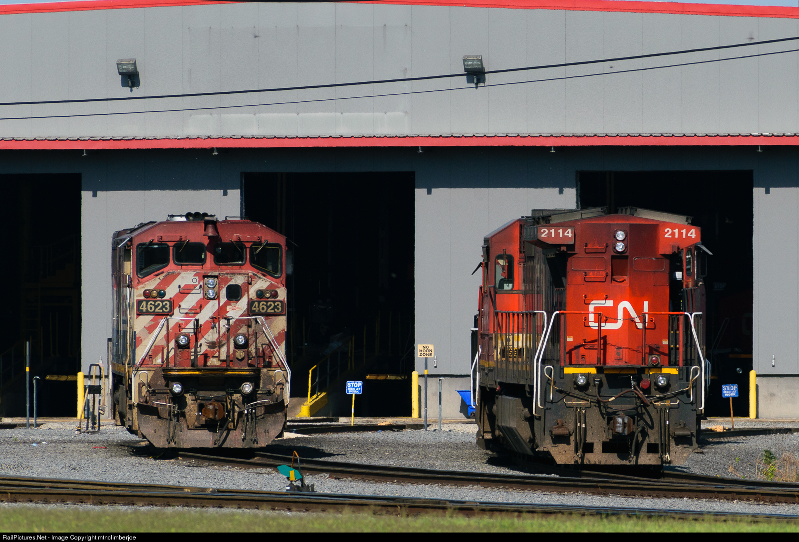 | A pair of CN locomotives sit outside the engine shops at CN's Harrison Yard in Memphis. C40-8M 4623 still wears the red, white, and blue BCOL paint and sits next to a C40-8 of CNW heritage. |