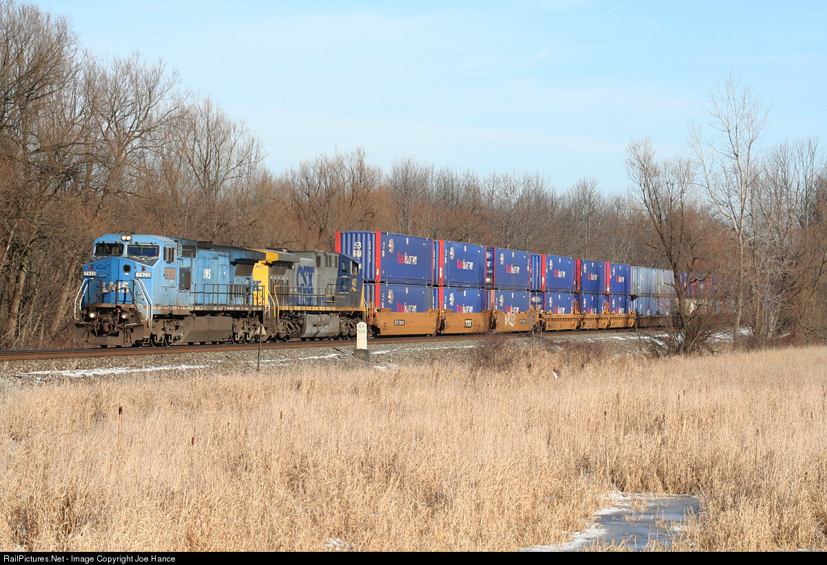 A former LMS C40-8W leads a westbound CSX intermodal near Lyons, NY