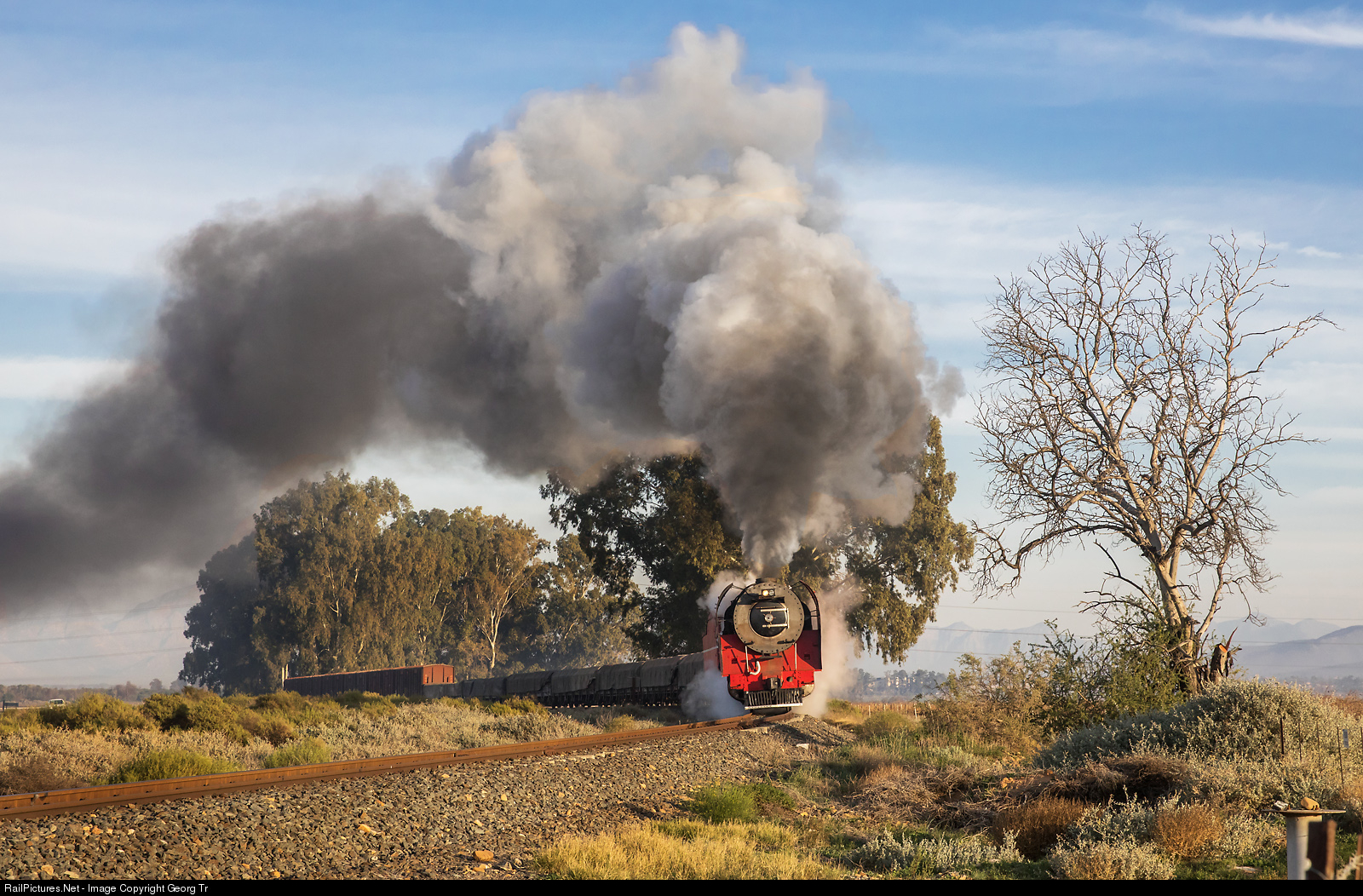 | The iconic 4-8-4 steamlocomotive "Red Devil" class 26 # 3450 (part of the Transnet National Collection, now maintained and operated by the Ceres Raill Company) is rounding a curve between Worcester and Over Hex on the line of the former New Cape Central Railway from Worcester to Robertson-Swellendam-Voorbai, with a 13 cars photo freight for FarRail Tours of Bernd Seiler. This most powerful narrow gauge (Cape gauge 1067 mm or 3 Ft 6 inch) steamlocomotive was rebuilt from 1979 to 1981 by David Wardale from a class 25NC (Henschel/Germany 1953). The locomotive is operational again since summer 2018 after 14 years decommission. |