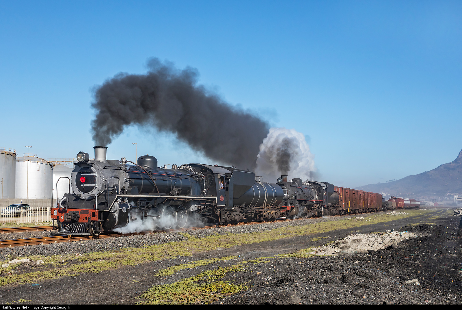 Steamtrain with 2-8-4 24 # 3655 and oil fired 4-8-2 19D # 3322 is leaving Cape Town along the shore of the Atlantic ocean, for a 9-day 1500 kilometer journey through the Western Cape province. A Ceres Rail Company trip for FarRail Tours of Bernd Seiler.