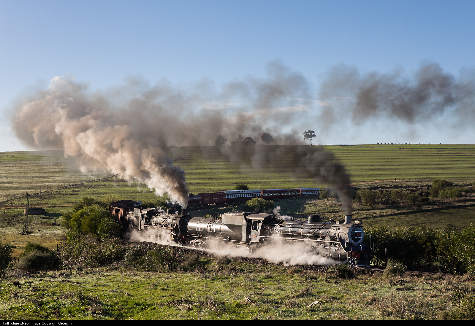 | The oil fired 4-8-2 steamlocomotive 19D # 3322 and the coal fired 2-8-4 24 # 3655 of the Ceres Rail Company are on the way with the FarRail Tours train between Malmesbury and Kanonkop on the Klawer line, running through a horseshoe curve. |