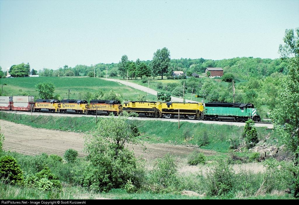 A colorful lashup leads the SeaLand stack train eastbound through the rural countryside. The lead unit was recently purchased from BN by NYS&W and would later wear the attractive Suzy-Q paint scheme.
