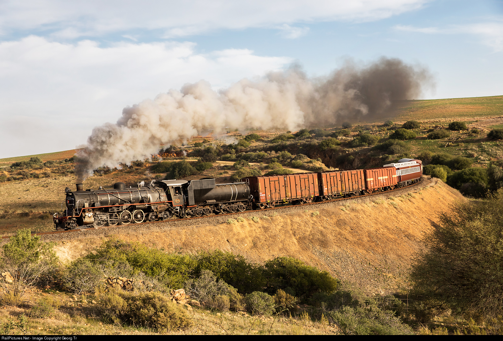 | 2-8-4 "Berkshire" steamlocomotive 24 # 3655 of the Ceres Rail Company/Atlantic Rail (owned by Cape Western Vintage Railways) was built in 1948/49 by the North Britisch Locomotive Company(NBL) in a series of 100 for the South African Railways (SAR), with a sixaxle MY (Buckeye 3-axle bogies) tender of 9 ton coal and 20 ton water capacity. This class served for branch line services with a maximum axle load of less then 12 ton. The locomotive is pulling the FarRail Tours passenger special southbound on the Klawer line between Moravia and De Hoek. |