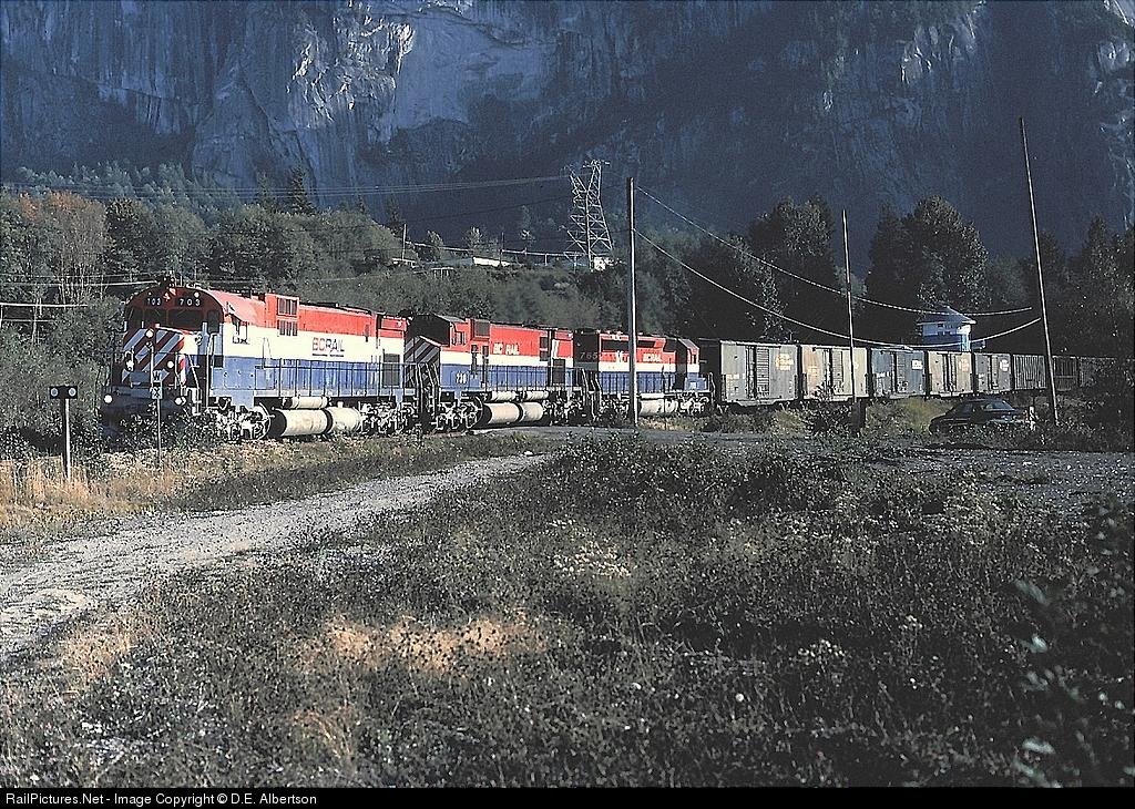 | BCR 703, 730, 765 lead this n/b into Squamish, BC. 03OCT89 |