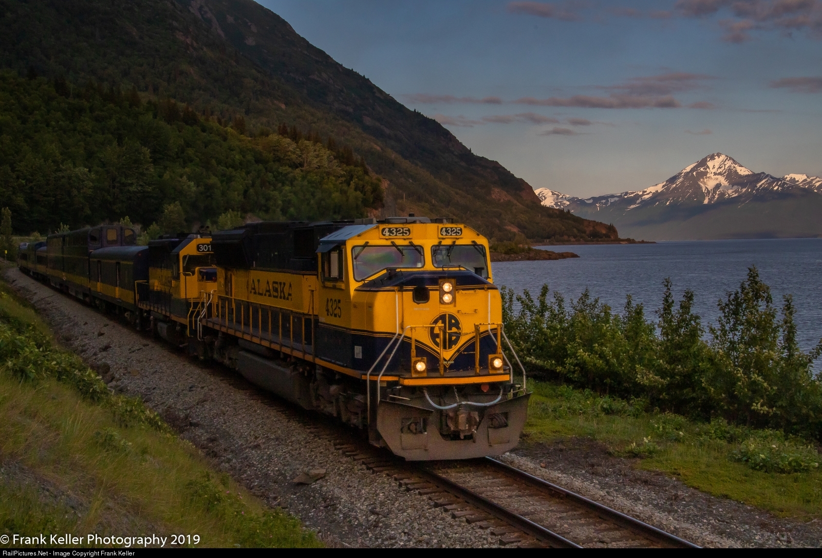 The returning Coastal Classic is right on time. And although we are more than two hours from sunset the Chugach Mountains have blocked the sun from reaching the rails casting a shadow across the train. While in the background the Kenai Mountains are still brightly lit making for a difficult exposure at best. Not a bad end result in my book.