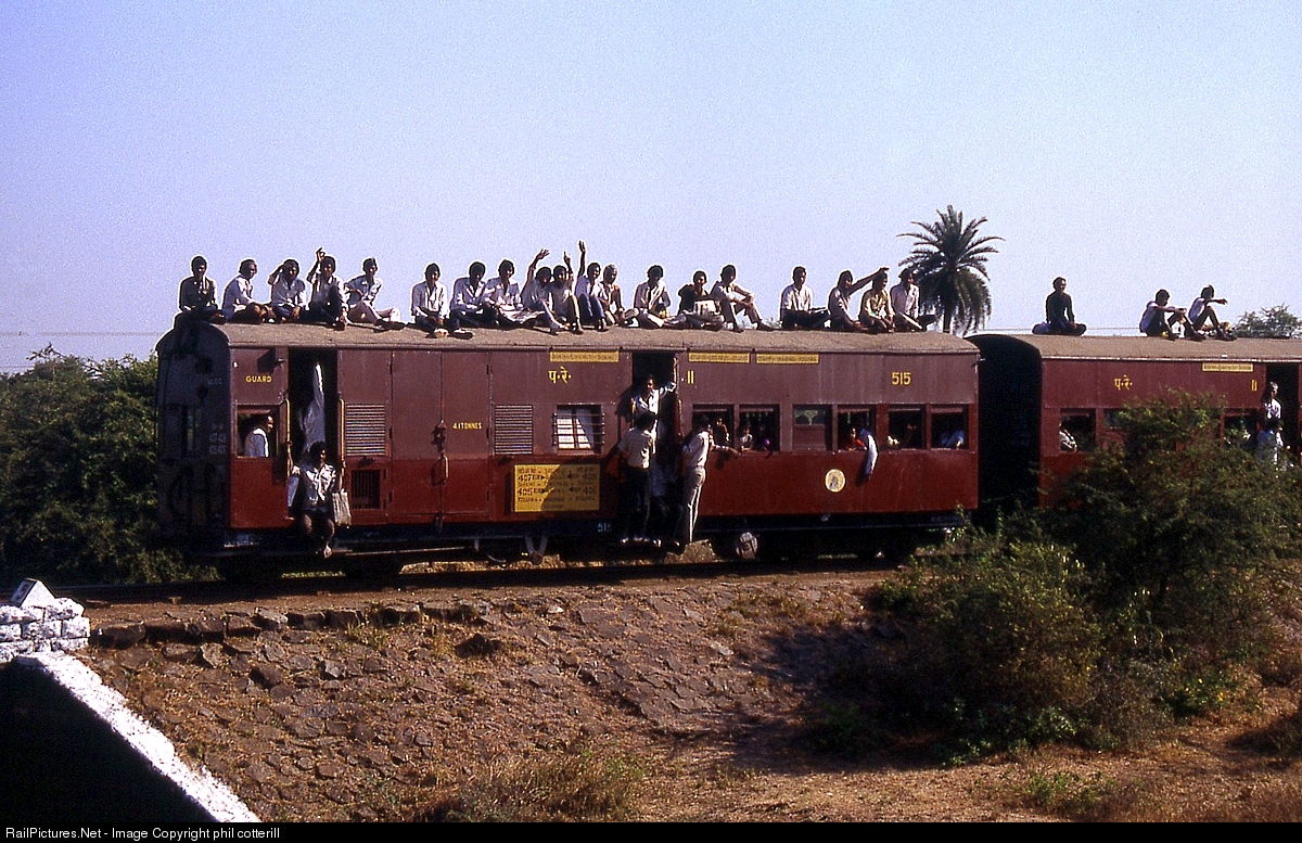 This is the rear carriage of a well loaded train on the 2 feet 6 inch gauge line at Kosamba, Gujarat, India, in 1989. The train was hauled by a ZB class, steam loco.