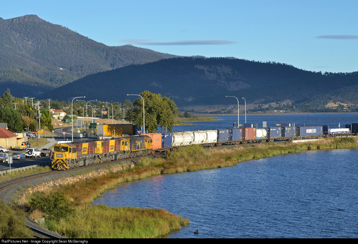 The overnight Burnie-Hobart intermodal rounds into Granton after crossing the Derwent River behind ex Queensland locos 2052 & 2051 with MKA2134 lending a hand as third unit. This section of track including the river causeway is now disused with all trains to Hobart now terminating at the outer-district Brighton Rail Hub.