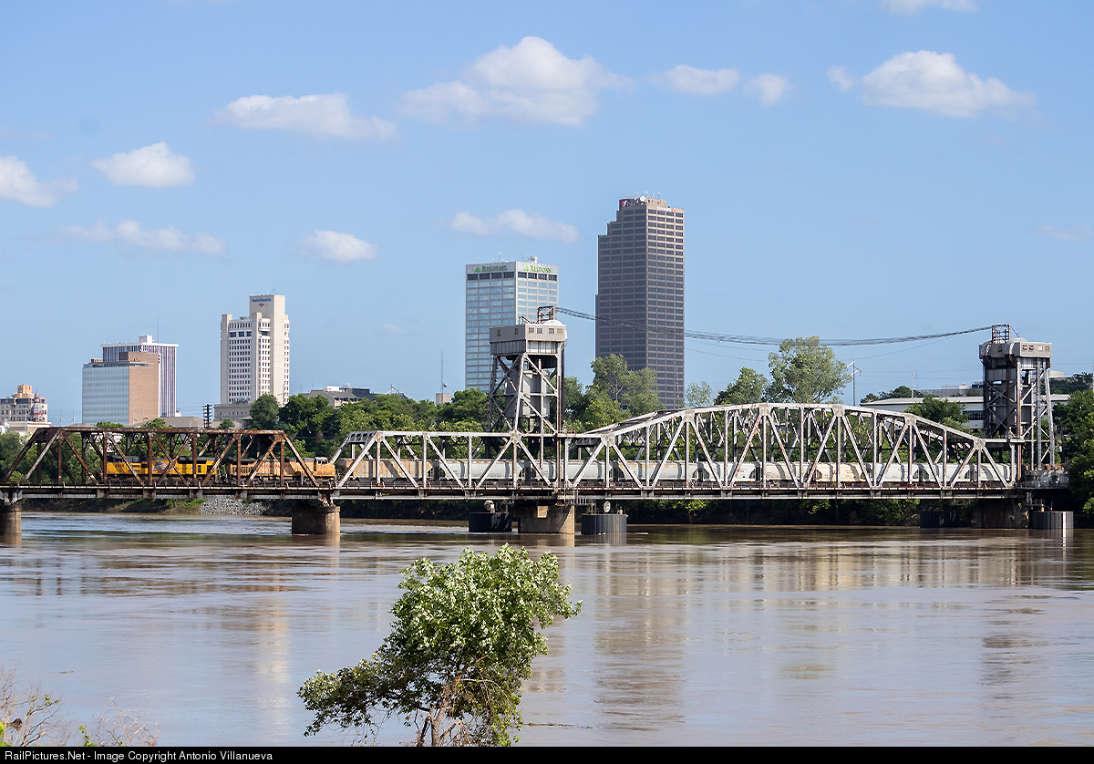 A manifest crosses the Arkansas River with the Little Rock skyline as it's background.