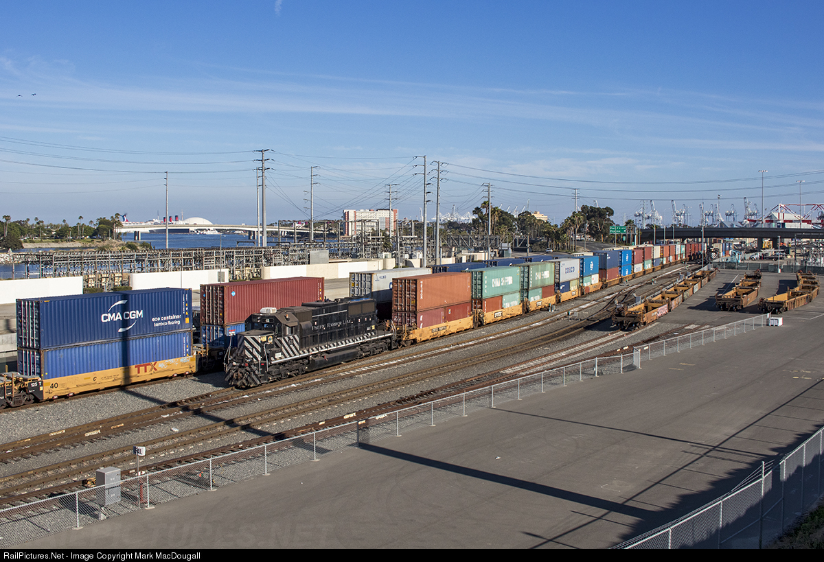 A PHL Dock Job shoves down Track 2 on the Pier J Lead in the Port of Long Beach bound for the Pacific Container Terminal. On the right, another Dock Job prepares to depart for Pier W out of the Long Beach Container Terminal. On the left is the south end of the Los Angeles River. The Queen Mary can be seen in the background.