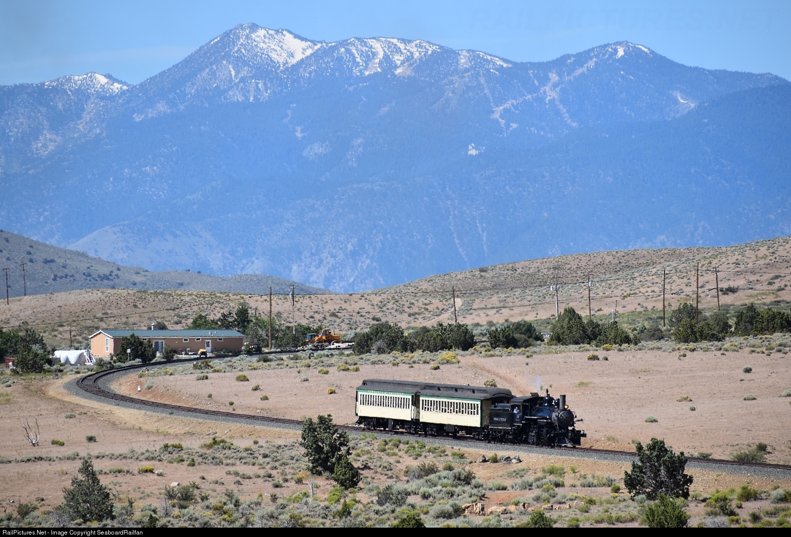 | V&T 2-8-0 number 29 leads the weekend passenger train from the Eastgate depot located between Mound House and Carson City up the 12 mile track towards Virginia City. In the background is the Sierra Nevada mountain range, still clinging onto some snow even as we near July here in Nevada |