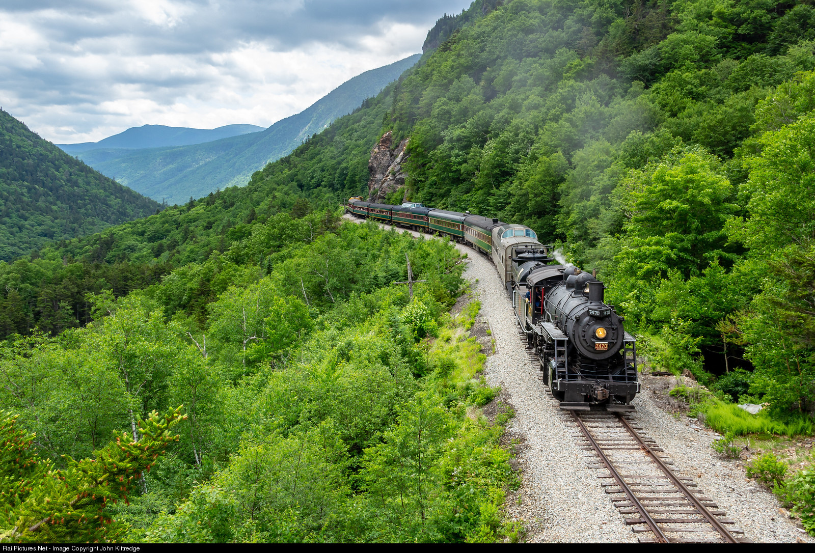 A Triumphant Return: On her debut excursion, Conway Scenic Railroad's former Canadian National 0-6-0 7470 clings to the cliffs high above the valley floor as it nears "The Gateway" in Crawford's Notch on the former Maine Central Mountain Division. Behind the locomotive is a tank car serving as an auxiliary water car, newly acquired ex Burlington Dome Car "Silver Splendor," six of the railroad's "Notch Train" cars, and engines 216 and 252 a GP35 and GP38 respectively. The 7470 had been out of service since 2015, and this was its first time through the notch since 2011. It looks and sounds great after receiving its 1472 day at Conway Scenic's shops.