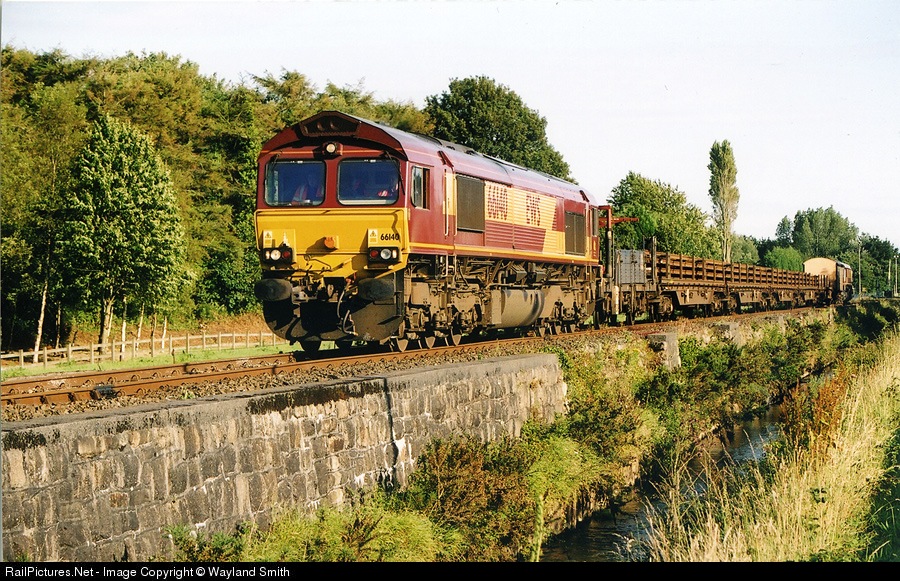 General Motors built 66140 leads a continous welded rail train out of St Blazey Depot towards engineering work taking place in the scenic Luxilyan Valley. 66066 is dead on the rear for the journey back.