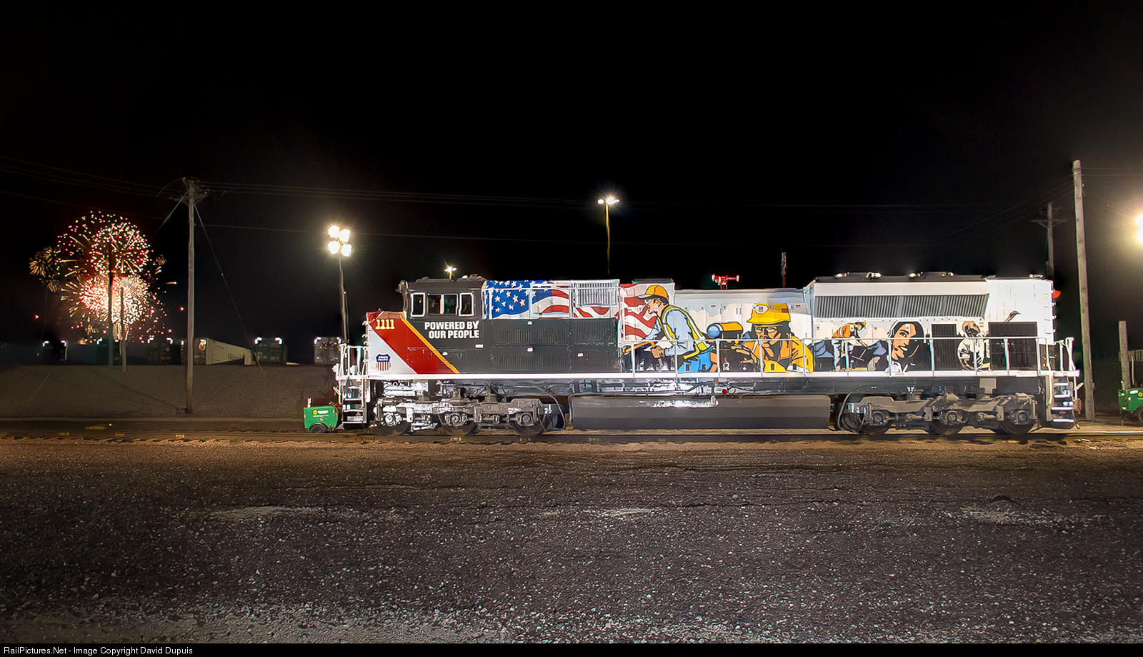 UP 1111 rests at Global II in Northlake, Illinois as a firework show takes place in the background.