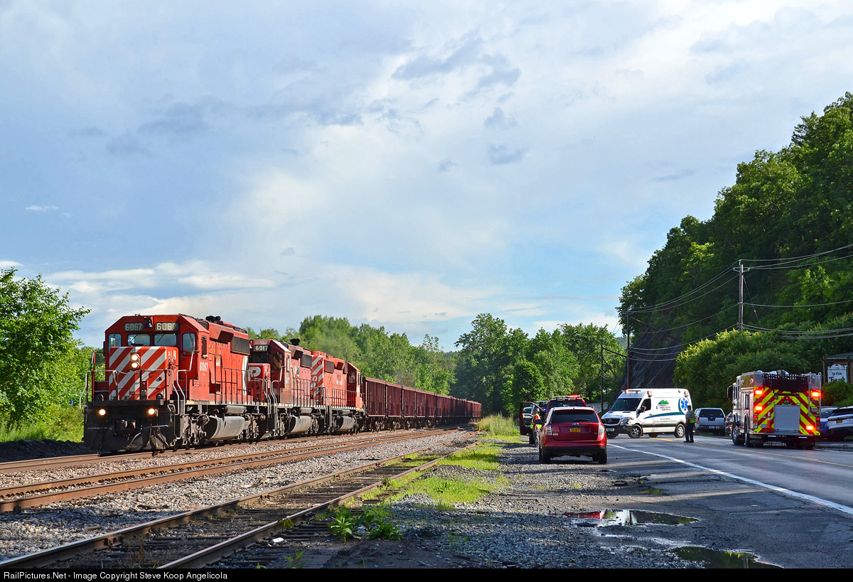 | A trio of SD40-2's lead a Canadian Pacific Herzog ballast train through Ticonderoga, NY. The emergency vehicles are there for a motor vehicle accident that happened just before the train arrived. |