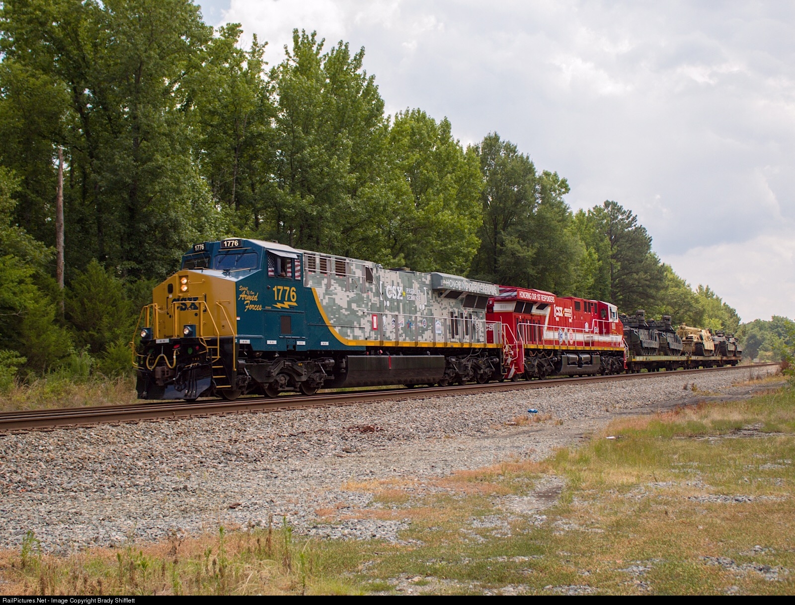 | CSX W990-29 flies by Henrico, VA with 2 brand new CSX spirit units in the lead and 3 military loads in tow |