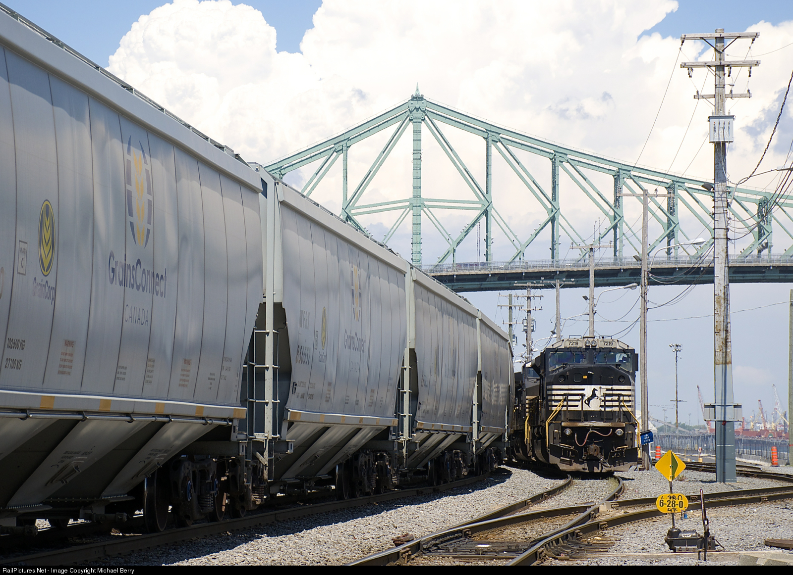 After bringing in a unit train of GrainsConnect cars (some seen at left), the power of CN 596 (NS 7219, NS 4028 & NS 9568) is stopped, awaiting the okay to leave the Port of Montreal light power. In the background is the Jacques-Cartier bridge.