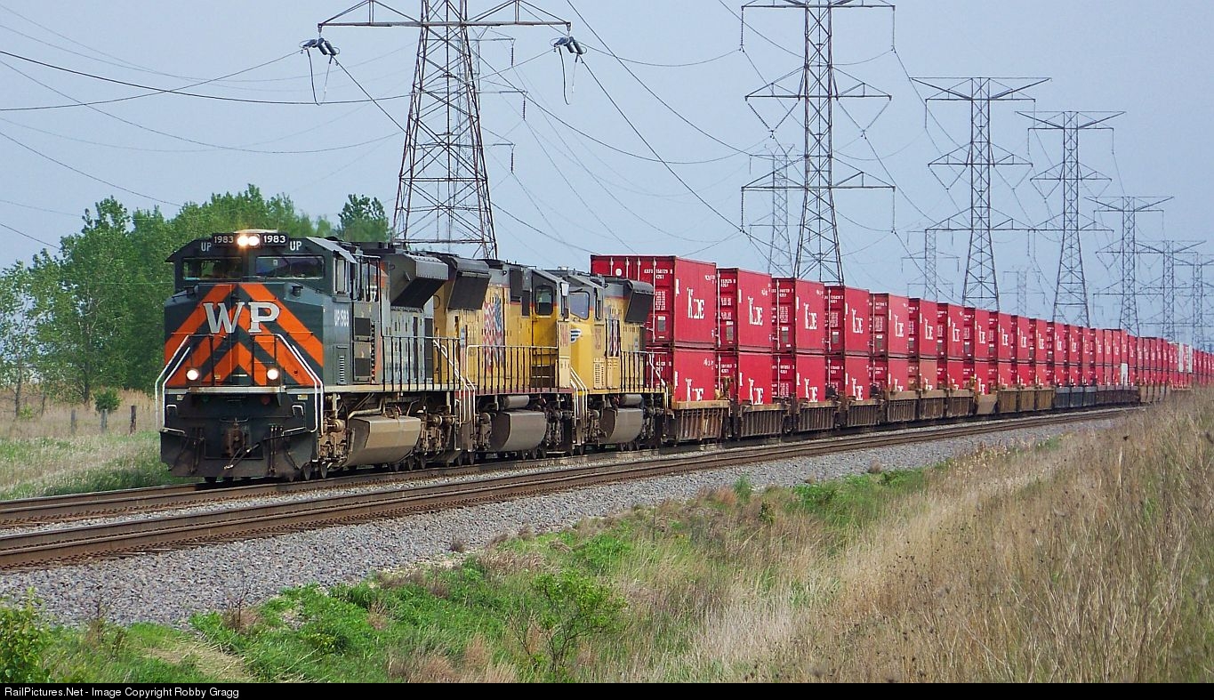 The WP heritage unit holds at 111th St near Normantown with a southbound stack train.