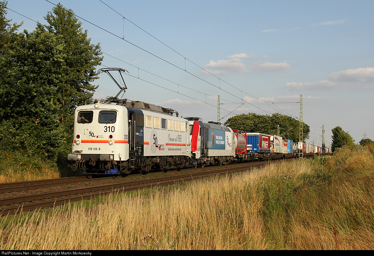 | Special coloured 139 135 with a special train celebrating 50th anniversary of Kombiverkehr KG from Frankfurt (Main) Ost to Cologne Eifeltor |