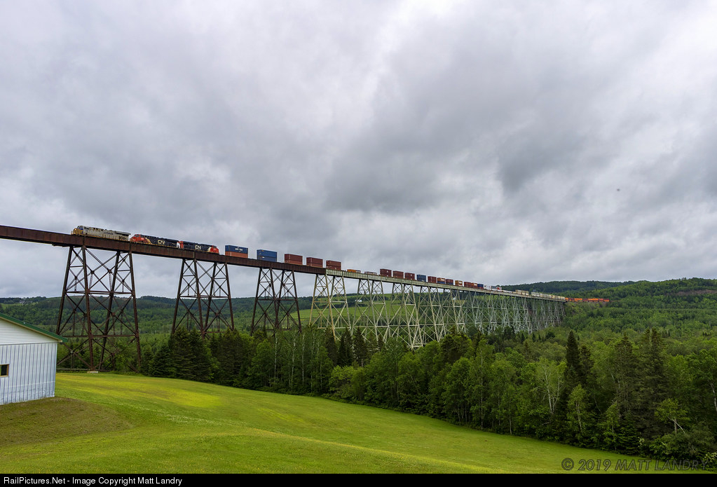 | Leaser power CREX 1518 leads stack train Q121 across the 3,920 foot Salmon River Trestle at New Denmark, New Brunswick. |