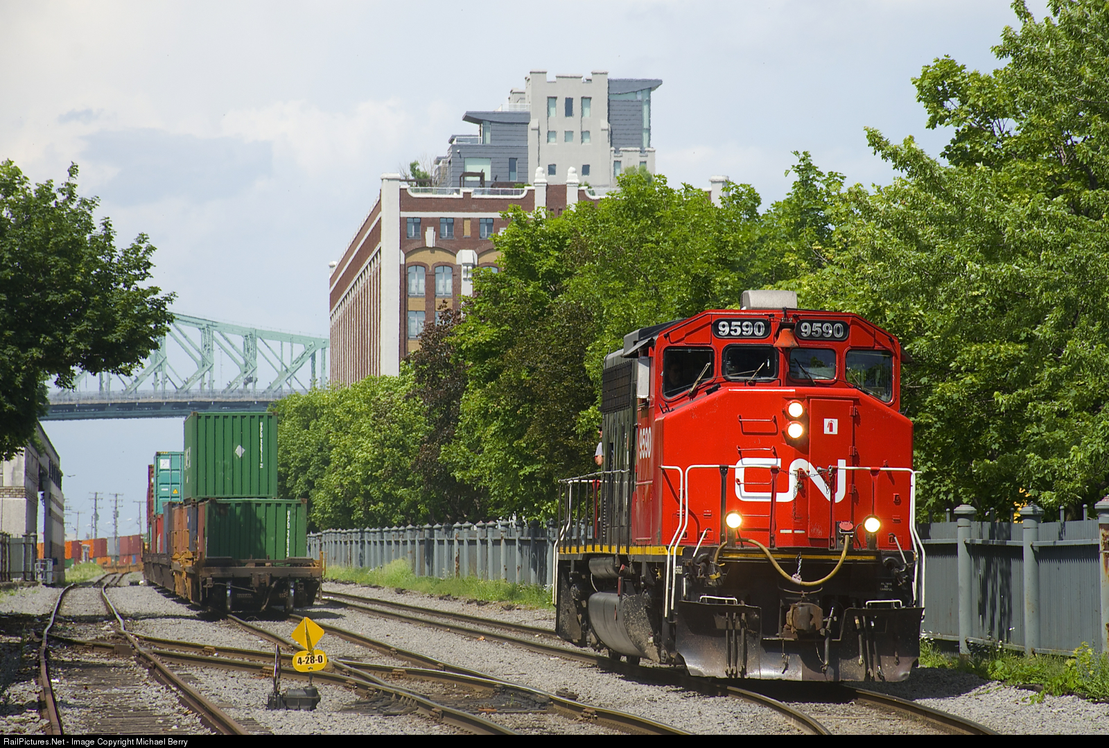 CN 9590 is heading light into the Port of Montreal to pick up some cars.