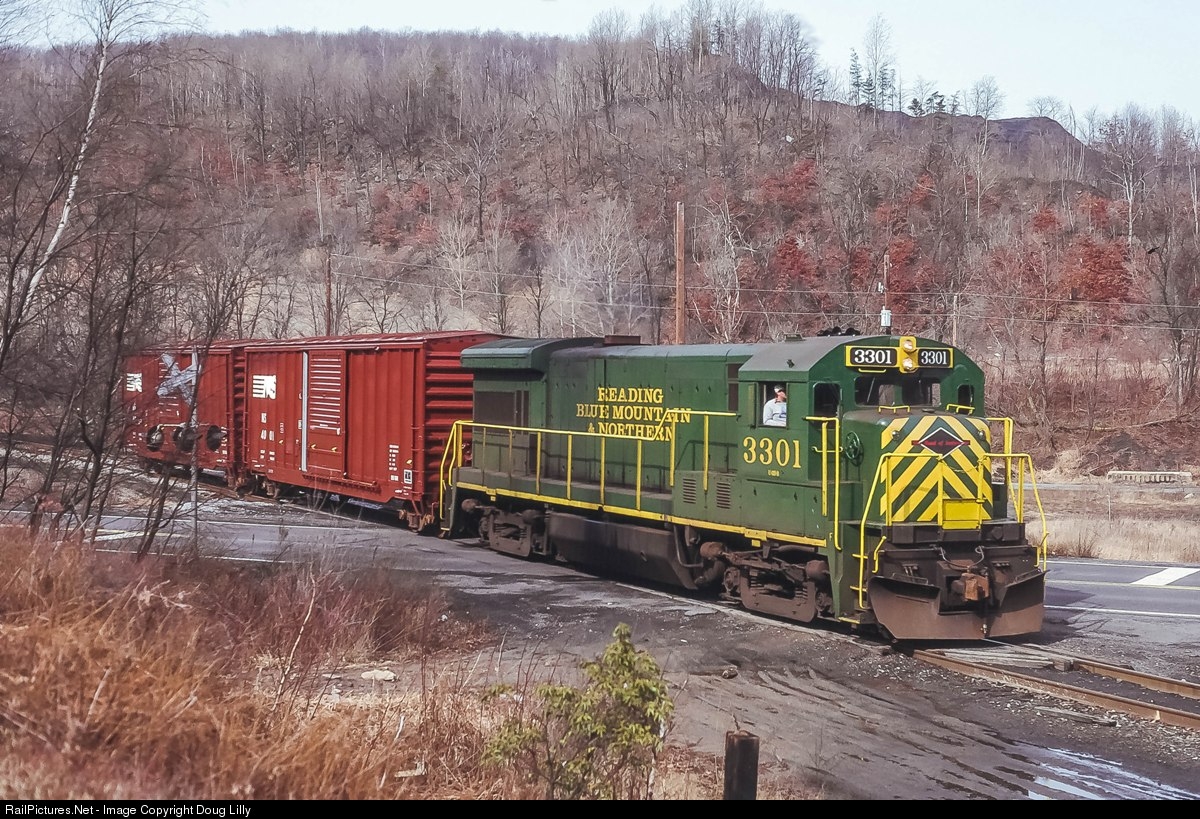 | With two cars from International Paper in Mount Carmel Junction, the Reading & Northern Mountain Job crosses Route 54 at Locustdale, Pennsylvania. |