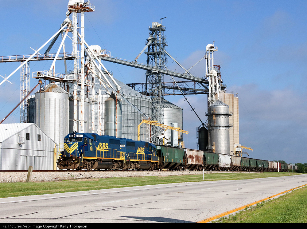 KBS 701 speeds past the old grain elevator in small town Swanington, Indiana.