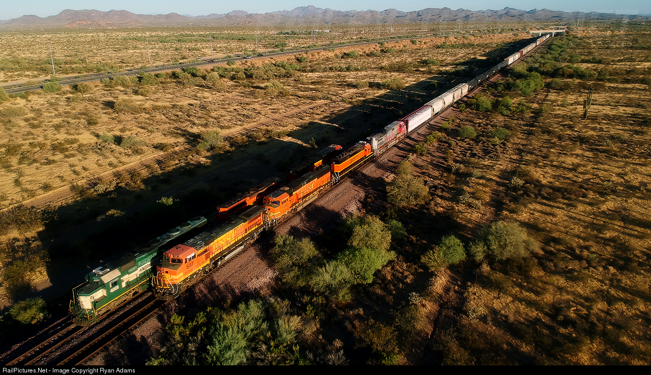 | In the extreme morning hours of July 4th 2019, the Arizona & California railway arrives into Castle Hot Springs siding along the BNSF "Peavine" subdivision to interchange with the BNSF railway. ARZC 4001 is the lone survior of the GW takeover of the railroad in its orignal paint scheme. |