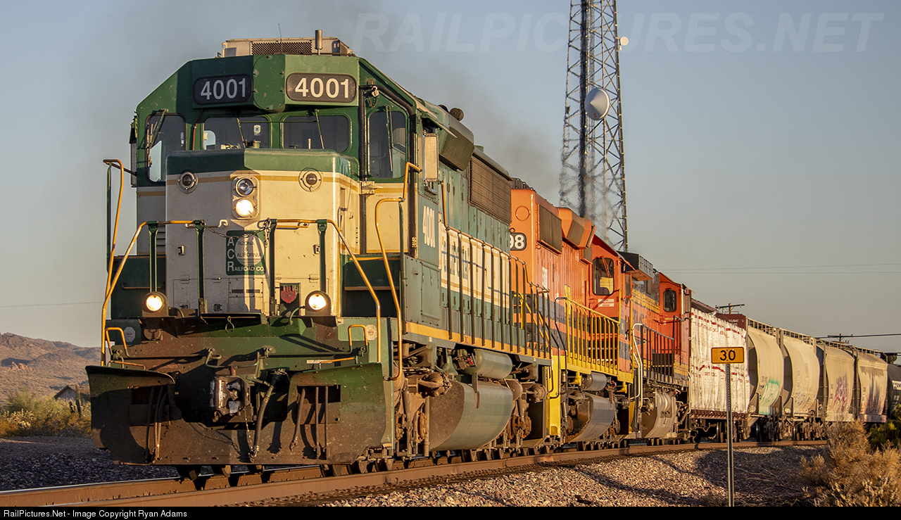| In the extreme morning hours of July 4th 2019, the Arizona & California railway arrives into Castle Hot Springs siding along the BNSF "Peavine" subdivision to interchange with the BNSF railway. ARZC 4001 is the lone survior of the GW takeover of the railroad in its orignal paint scheme. |