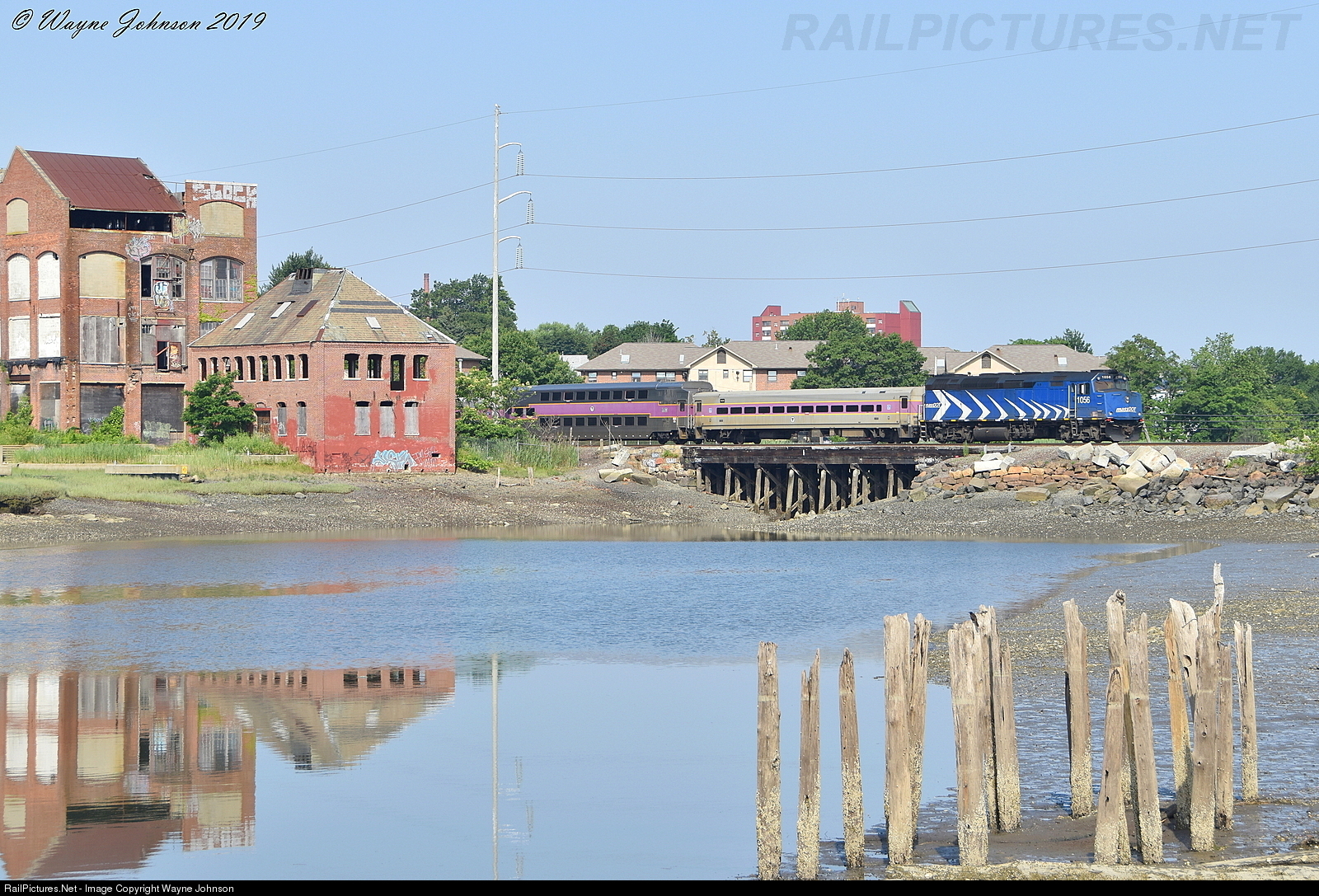 Sporting the blue MassDOT "fishbone" paintjob, #1056 shoves Beverly local train No. 192 over Chelsea Creek towards Boston. Chelsea Creek was host to the first Naval engagement of the American Revolution on May 27, 1775!