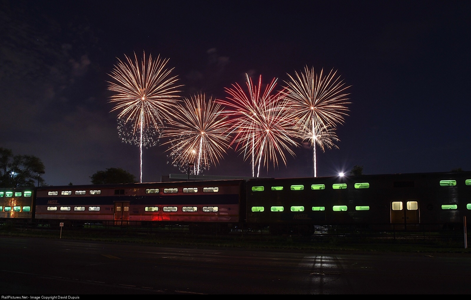 Fireworks from Arlington Park explode over an inbound Metra making a station stop.