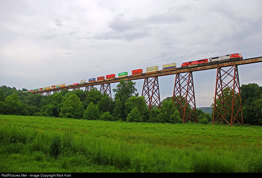 A pair of Indiana Rail Road SD9043MAC's, led by their 25th Anniversary unit, lead westbound train SAHW over the iconic Tulip Trestle. The trestle was built in 1906, stands at 157 feet tall and spans an impressive length of 2,307 feet. Just west of here, the train will meet eastbound counterpart HWSA.