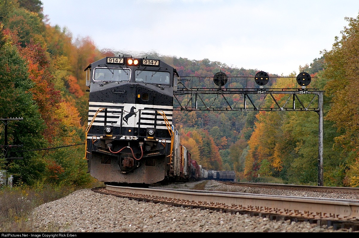 On one of those moody, overcast autumn afternoons, NS 9147 is slugging it out on the ascent to Gallitzin. Most regrettably, the signal bridge of Pennsylvania Railroad origin no longer stands to speak of the heritage of this route.