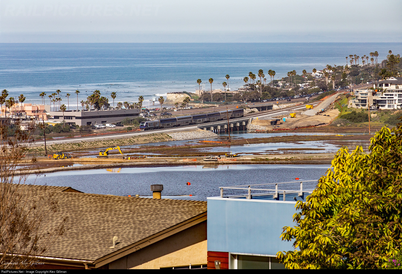 Amtrak 569 heads north toward Los Angeles as it cruises through Cardiff and approaches the newly built concrete bridges that replaced the original Santa Fe-built, wooden structures here.